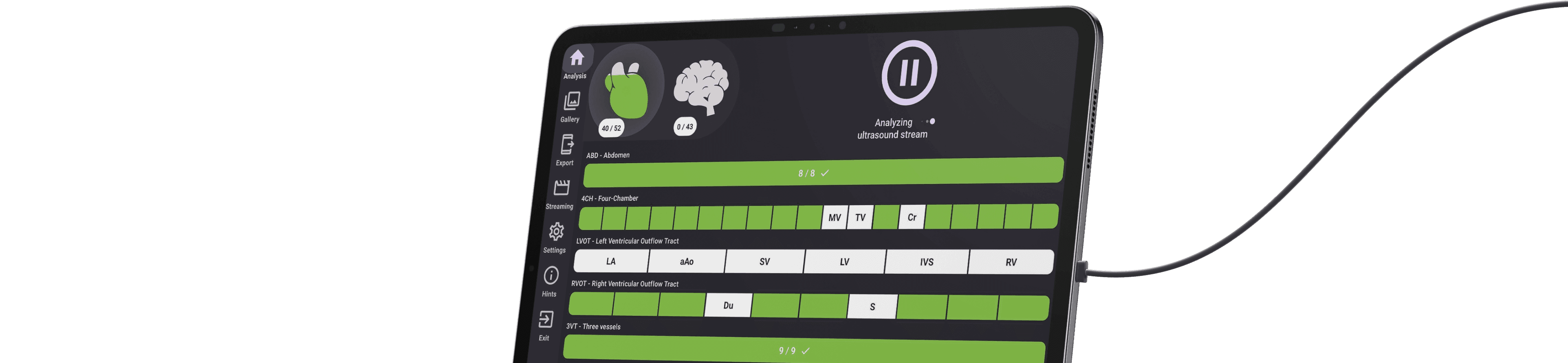 Experience real-time AI assistance - simply download our app to your tablet, connect it via HDMI to your ultrasound device, and receive instant and continuous feedback during your entire examination.